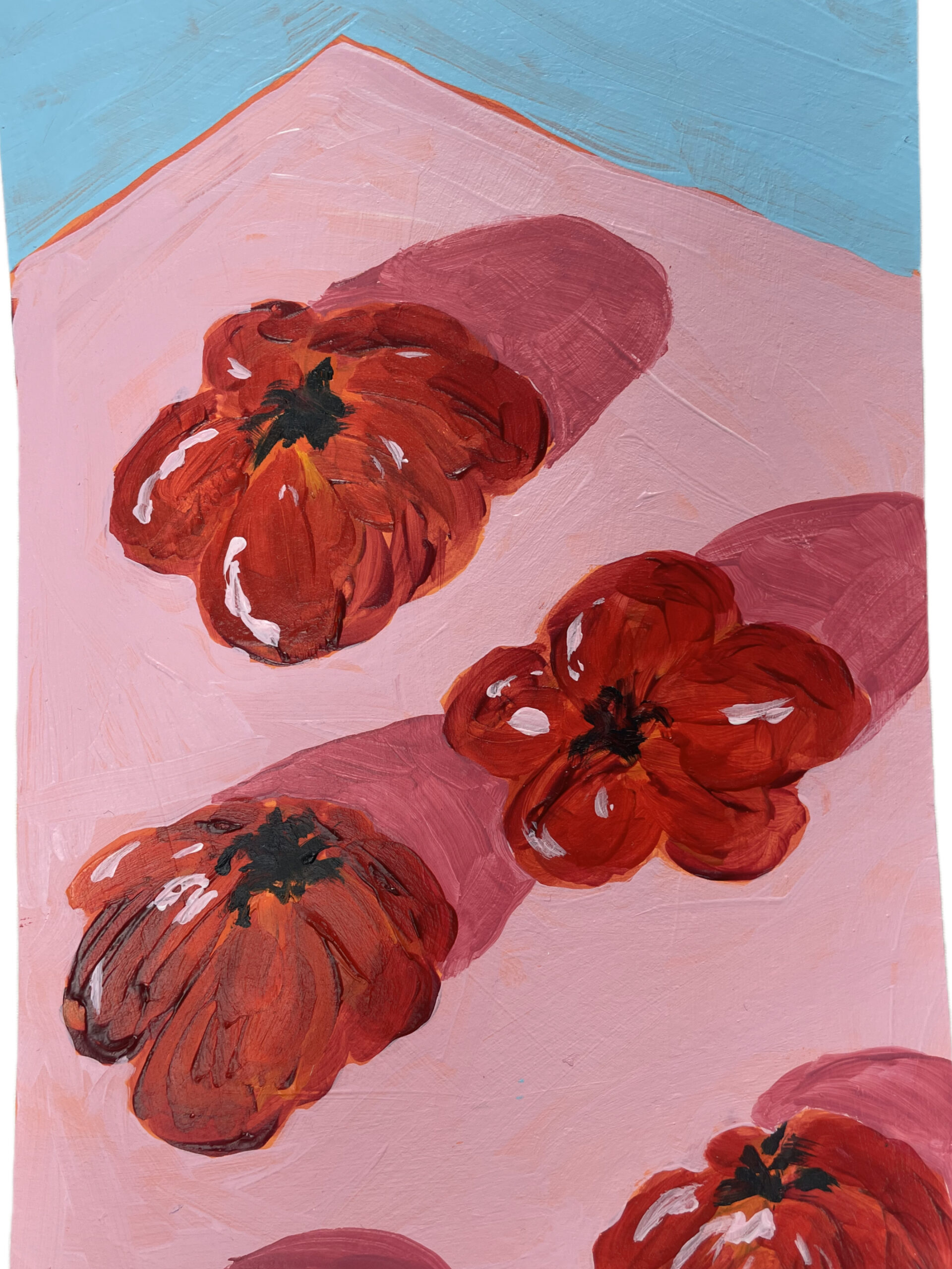 Four vibrant tomatoes on a pastel pink and blue background, painted in a bold, modern style.