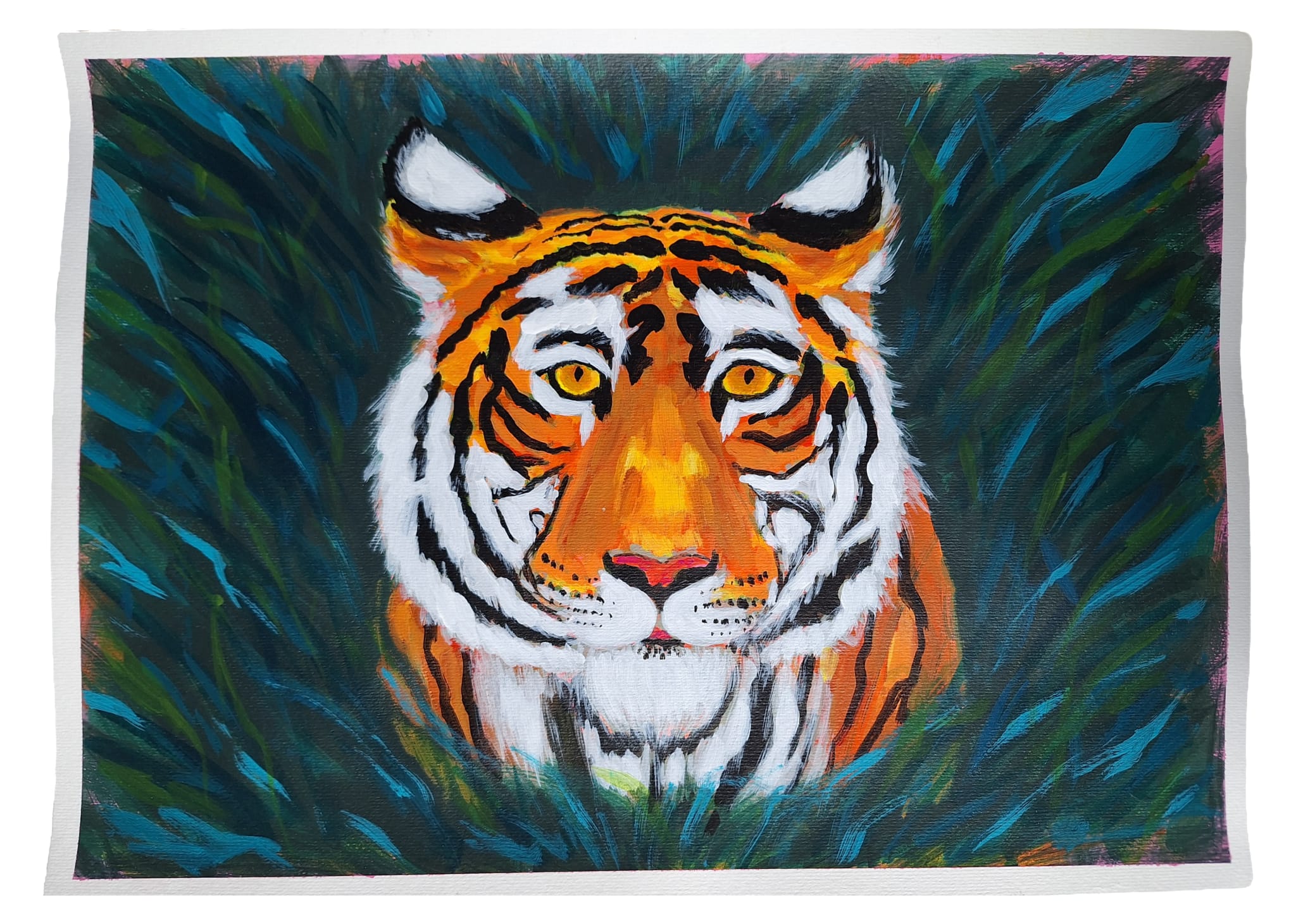 A striking portrait of a tiger with vivid orange, black, and white fur, emerging from lush green grass. The animal’s intense yellow gaze and bold brushstrokes create a sense of power and presence in this modern wildlife painting.